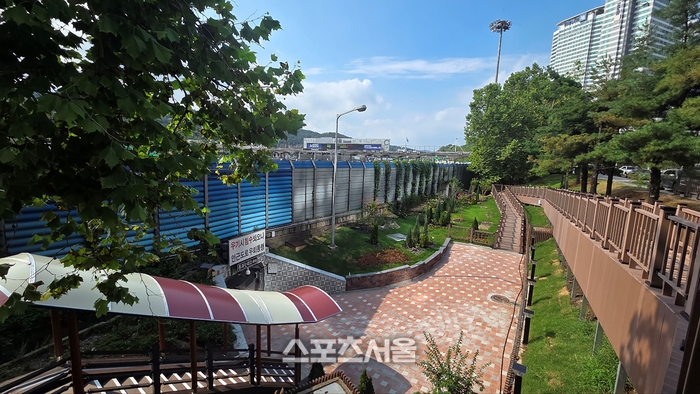 이중 지붕 달린 나무 계단과 태양광 조명시설은 인근 두산에너빌리티와 HD한국조선해양이 각각 5000만원씩 기부한 기금(1억원)으로 설치했다. 이 시설은 시에 기부채납 될 예정이다.