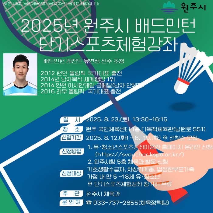 시는 유명 스포츠 강사를 초빙해 수강생들에게 강습비와 운동용품 등을 전액 무료로 지원할 계획이다. 운영 종목은 배드민턴과 댄스로, 배드민턴 국가대표 출신 유연성 선수와 마네퀸 소속 벅키 댄서가 8월 23일 원주국민체육센터 1층 다목적체육관에서 강습을 진행한다.