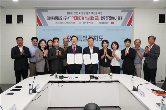 [스포츠서울ㅣ춘천=김기원기자]강원특별자치도(도지사 김진태)는 ㈜케이티(KT)와 8월 12일(화), 도 영상회의실에서 데이터 기반 에이아이(AI)행정 본격 시행을 위한 「민간데이터 공동활용 추진 업무협약(MOU)」을 체결했다.