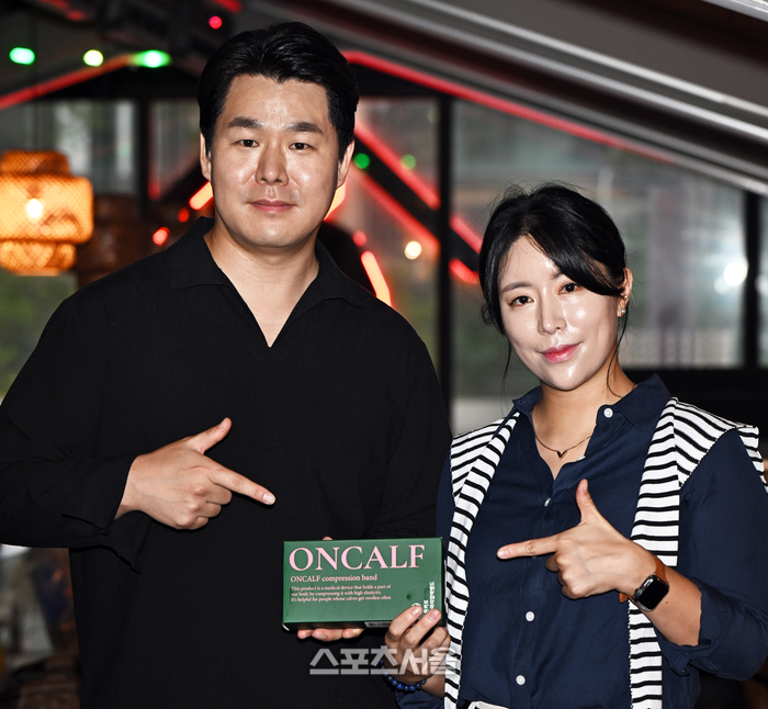 신승기 명인엔터테인먼트 대표와 피트니스 레전드 김한나가 포토월을 소화하고 있다.