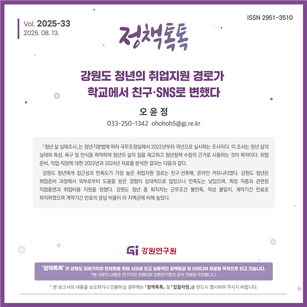 [스포츠서울ㅣ춘천=김기원기자]강원연구원(원장 현진권)은 “강원도 청년의 취업지원 경로가 학교에서 친구・SNS로 변했다”라는 제목으로 2025년 제33호 정책톡톡을 발간했다.