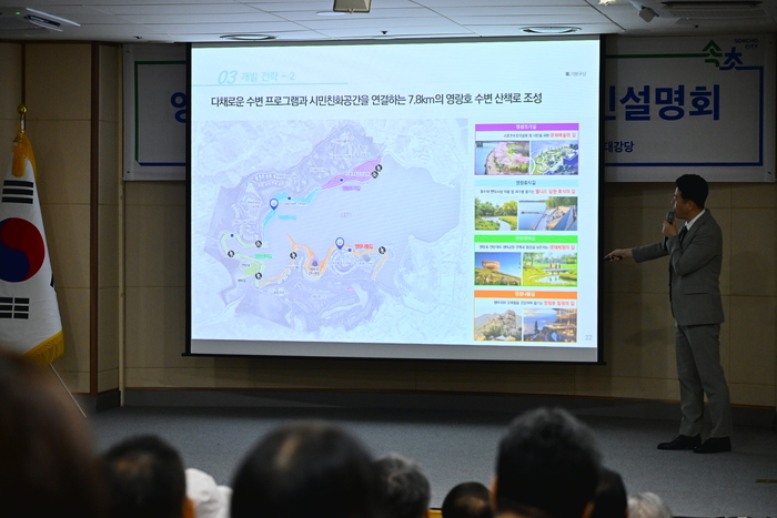설명회에서는 ▲사업 배경과 개요, 추진 경과 ▲영랑호 주변 환경과 자원 활용 방안 ▲주요 시설 조성계획과 기대되는 경제·문화적 파급효과 ▲전략환경영향평가(초안) 등이 상세히 소개됐다. 이후 진행된 질의응답에서는 북부권 활성화를 위한 실질적 대책, 지역 주민 일자리 창출, 교통·기반시설 확충 등 생활과 직결된 주제들이 논의됐다.