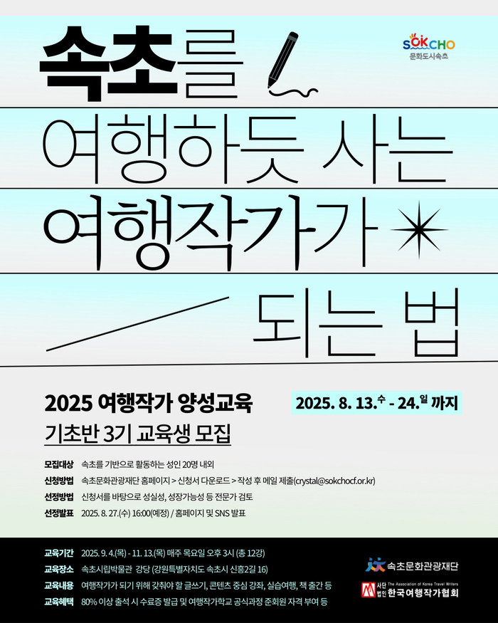 재단 관계자는 “이번 교육을 통해 배출되는 여행작가가 단순 관광 홍보를 넘어 계절·세대·취향별로 다채로운 여행 콘텐츠를 발굴하는 ‘지역 스토리텔러’로 활동해, 속초가 ‘머물고 싶은 문화관광도시’로 자리매김하기를 바란다”라고 전했다.