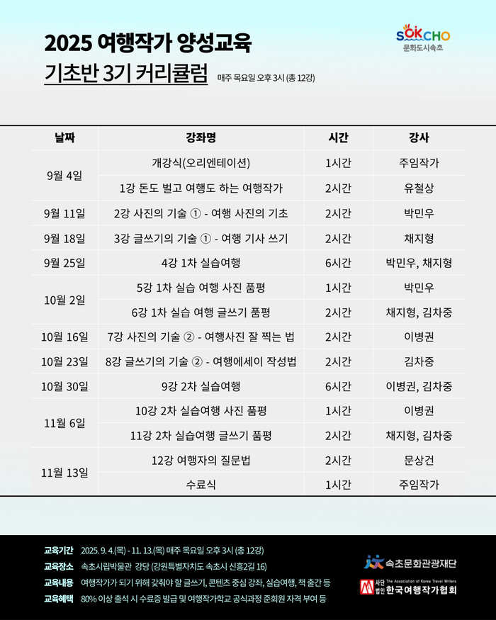 교육과정에는 ‘글쓰기·사진 촬영 기술’, ‘여행과 여행 글쓰기’ 등 콘텐츠 중심 강좌와 함께, (사)한국여행작가협회 유상철 회장, 1세대 여행작가 채지형 작가 등 국내 대표 여행작가들의 실전 사례강의가 포함된다. 또한 속초를 새롭게 조망하는 실습 여행, 예비 여행작가들이 함께하는 공동 도서 출간 프로젝트도 진행된다.