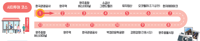 올해 7월 15일(화)부터 주요 관광지를 확대 운행하는 전면 개편에 따라 오전 시간대에 소금산그랜드밸리 등 주요 관광지를 둘러보고 오후에는 관광객들이 시내 주요 관광지로 쉽게 이동할 수 있도록 한지테마파크, 박경리문학공원, 전통시장 등이 코스에 포함됐다