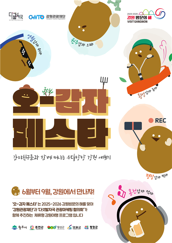 [스포츠서울ㅣ춘천=김기원기자]강원관광재단(대표이사 최성현, 이하 재단)은‘2025-2026 강원 방문의 해’를 맞아 영서 내륙 5개 시군과 함께 다섯발자국 공동 홍보 마케팅 사업의 일환으로 새로운 체류형 관광 상품 네 번째 ‘오감자 페스타’를 8월 30일(토)부터 31일(일)까지 영월에서 개최한다고 밝혔다.