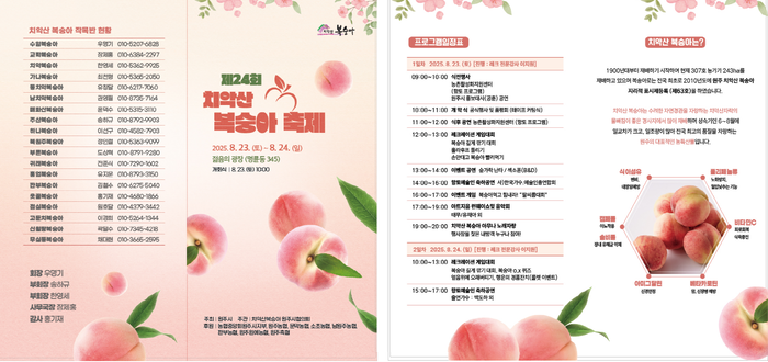 올해로 24회를 맞이한 치악산복숭아 축제는 원주시 대표 농산물인 치악산복숭아의 우수성을 널리 알리고, 도시와 농촌 간 상생의 장을 마련해 소비자 인지도를 높이기 위한 행사다.