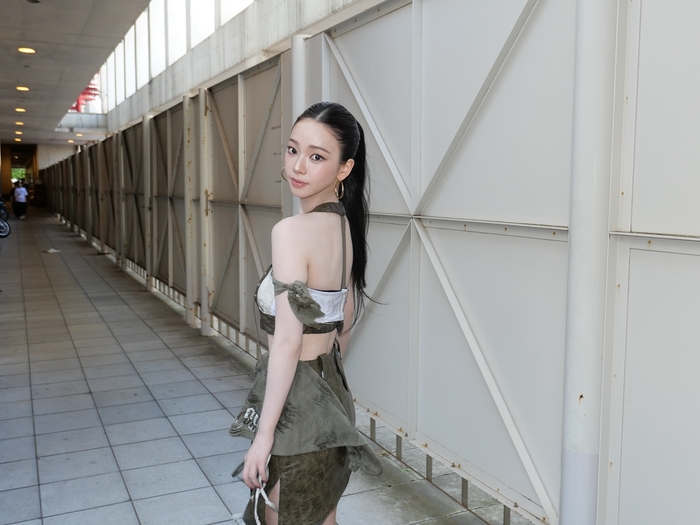 공개된 사진에서 카리나는 깊은 카키톤이 돋보이는 파격적인 의상과 함께, 톱과 스커트에 독특한 레터링과 끈 디테일이 더해진 스타일링으로 독보적인 존재감을 드러냈다. 특히 긴 생머리를 높게 묶어 올린 포니테일 헤어와 과감한 골드 이어링이 카리스마를 더욱 돋보이게 했다.