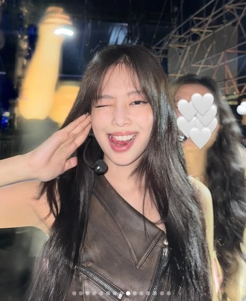 제니는 18일 SNS를 통해 밀라노 콘서트 비하인드 컷을 공개했다. 연핑크 투피스, 블랙 실크 셔츠, 바디슈트까지.