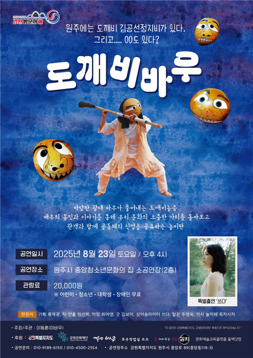 [스포츠서울ㅣ원주=김기원기자]강원문화재단(대표이사 신현상)은 2025 원로예술인지원 사업 선정작 ‘도깨비 바우’ 공연이 23일(토) 오후 4시 중앙청소년문화의집 소공연장에서 열린다고 밝혔다.
