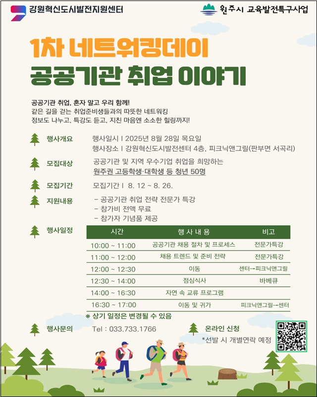 이번 프로그램은 공공기관 및 지역 우수기업 취업을 희망하는 원주권 고등학생·대학생 등 청년들을 대상으로 강원혁신도시발전지원센터와 자연체험공간 ‘피크닉앤그릴’에서 오전 10시부터 오후 5시까지 진행되며, 청년들의 공공기관 취업 역량 강화와 심리적 재충전을 목표로 마련되었다.
