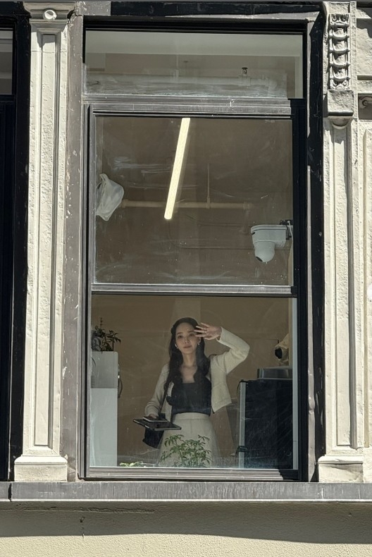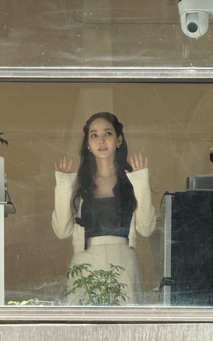 또 다른 컷에서는 블랙 톱에 크롭 가디건을 매치하고 창밖을 응시하는 장면이다. 투명한 피부와 여리여리한 체구가 돋보인다.