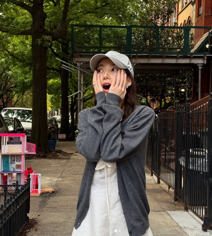 화이트 미니 드레스 위에 그레이 카디건을 걸치고 화이트 스니커즈와 볼캡을 매치한 모습은 ‘꾸안꾸’ 패션의 정석. 양갈래 땋은 머리로 상큼한 매력을 더해 팬들의 시선을 사로잡는다.
