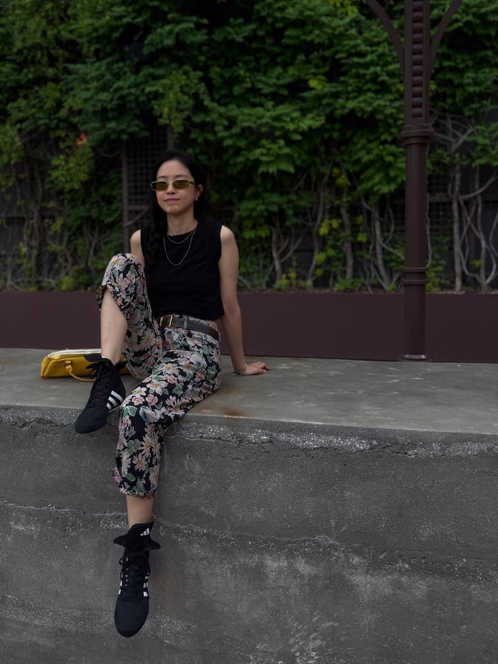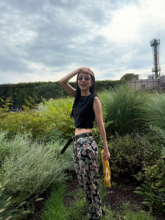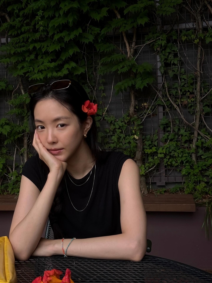 공개된 사진 속 손나은은 검은색 민소매 톱에 플라워 패턴의 팬츠, 블랙 스니커즈로 스타일링했다. 머리 위에는 선글라스를 올린 채, 귀에는 큐브 모양의 골드 이어링을 착용했고, 한쪽 귀에 붉은색 꽃을 꽂아 포인트를 더했다.