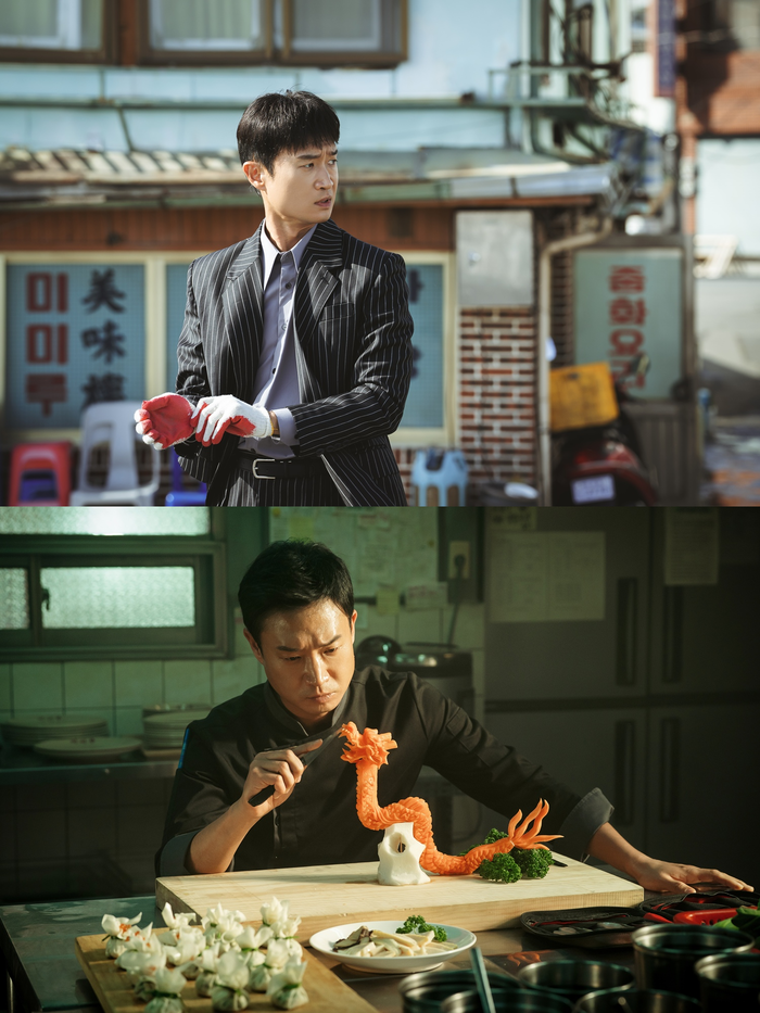 또 다른 스틸에선 정장을 입은 채 목장갑을 낀 순태의 거친 분위기와 음식을 조각하는 섬세한 모습이 극과 극 매력을 드러낸다.