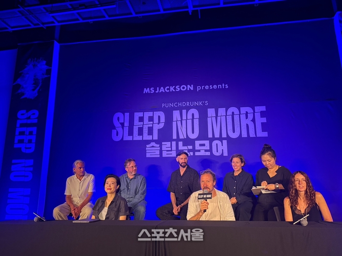 ‘슬립 노 모어’의 연출진은 20일 서울 중구 매키탄호텔(구 대한극장)에서 열린 기자간담회에서 작품 소개와 함께 공연의 숨은 매력을 소개했다. 이 자리에는 작품을 한국에 들여온 미쓰잭슨 주식회사 박주영 대표를 비롯해 펀치드렁크 창립자 겸 연출인 펠릭스 바렛, 맥신 도일 공동 연출 및 안무가, 콜린 나이팅게일 프로젝트 어드바이저, 사이먼 윌킨 슨 조명 디자이너, 데이비드 이스라엘 레이노소 의상 디자이너, 비아트리스 민스 디자이너가 참석했다.