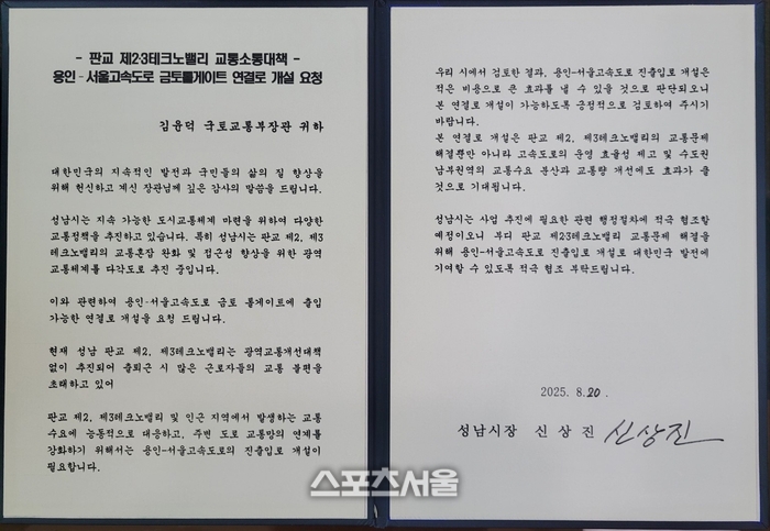 신 시장은 같은 날 또 다른 서한을 통해 판교 제2·3테크노밸리 교통문제 해결 방안으로 용인–서울고속도로 금토 톨게이트 연결로 개설을 요청했다.