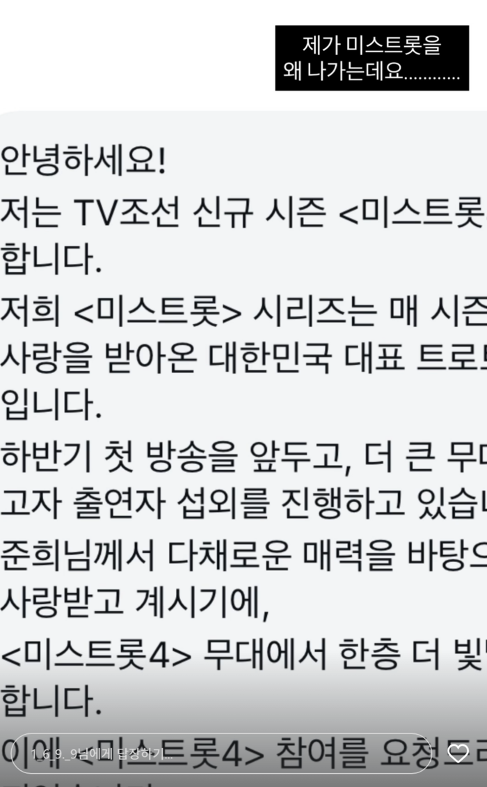 내용에는 “하반기 첫 방송을 앞두고 더 큰 무대를 꾸미고자 출연자 섭외를 진행하고 있다”며 “준희 님께서 다채로운 매력을 바탕으로 많은 사랑을 받고 계시기에 ‘미스트롯4’ 무대에서 한층 더 빛낼 수 있을 거라 생각한다. 이에 ‘미스트롯4’ 참여를 요청드린다”고 적혀있다.