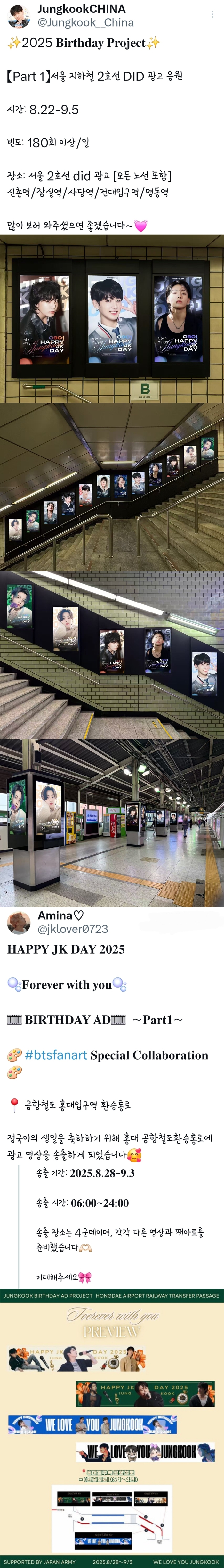 또 다른 팬 ‘Amina’는 8월 28일부터 9월 3일까지 홍대입구역 공항철도 환승 통로 4곳 전광판에서 정국의 생일 축하 영상을 선보인다.