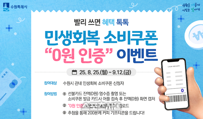 〔스포츠서울│수원=좌승훈기자〕경기 수원시는 민생회복 소비쿠폰 사용을 독려하기 위해 오는 25일부터 9월 12일까지 ‘0원 인증 이벤트’를 연다고 21일 밝혔다.