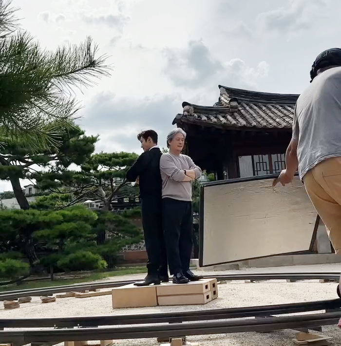 공개된 사진에는 전통한옥 앞, 경쾌한 푸른 하늘 아래 두 사람이 등을 맞대고 서 있는 모습이 담겼다. 세트에는 원형 레일과 촬영 장비가 마련되어 있었고, 둘은 제작진의 지시에 따라 주머니에 손을 넣거나 팔짱을 끼는 등 다양한 포즈를 취하며 촬영을 진행했다. 촬영팀이 리플렉터 등 전문 장비로 빛을 조절하는 모습도 엿보여 긴장감과 열정이 깃든 현장 분위기가 느껴진다.
