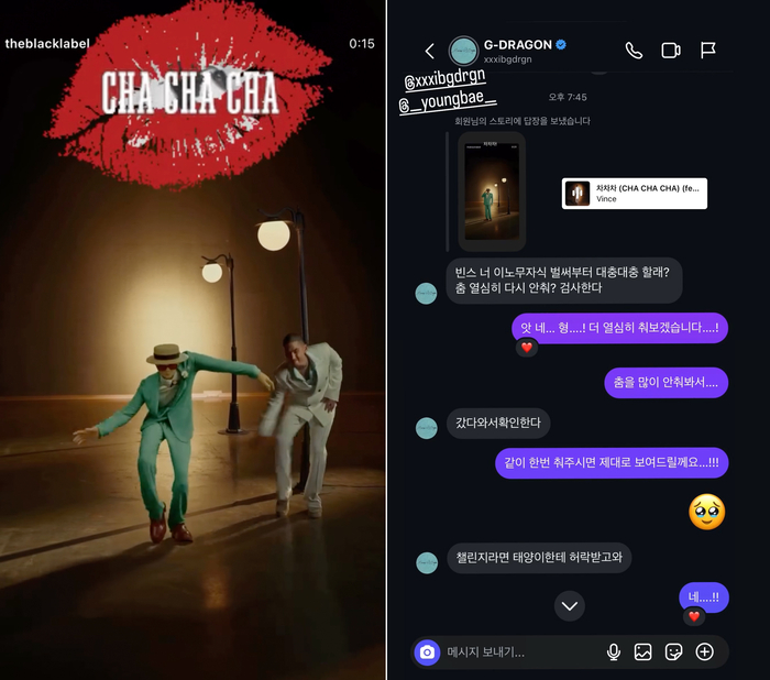 지드래곤은 애니메이션으로 제작된 ‘차차차’ 챌리지 영상을 언급하며 “너 이노무자식. 벌써부터 대충대충 할래? 춤 열심히 다시 안 춰? 검사한다”고 농담 섞인 메시지를 보냈고, 빈스는 “더 열심히 춰보겠다”, “춤을 많이 안 춰봤다”고 답하는 등 두 사람 특유의 재치 있는 티키타카를 선보였다. 이어 지드래곤은 “갔다와서 확인한다”, “챌린지라면 태양이한테 허락받고 와”라며 빈스에게 유쾌한 압박(?)을 가하기도 했다.
