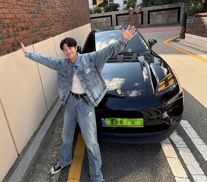 정준원은 골목길에서 포르쉐 차량 앞에서 두 팔을 활짝 벌려 환하게 웃으며 행복한 분위기를 자아냈다.