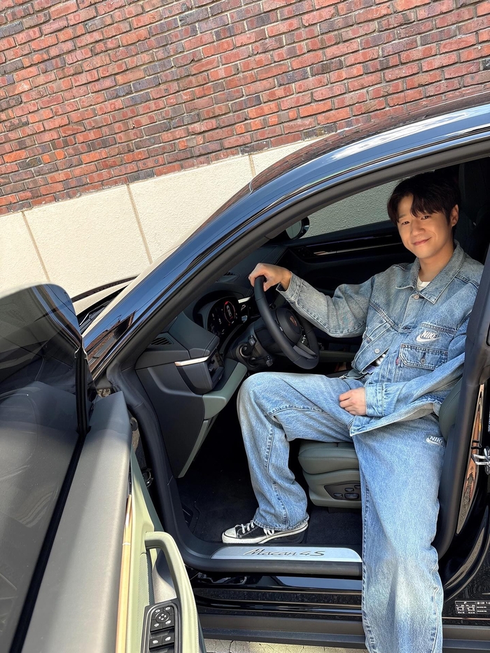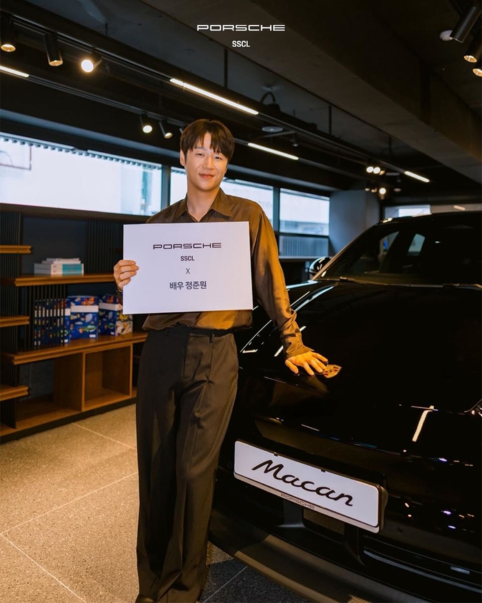 정준원은 포르쉐 매장에서 ‘마칸(Macan)’ 옆에서 앰버서더 선정 인증 보드를 들고 서 있다. 깔끔한 차림새와 세련된 분위기로 포르쉐 브랜드의 프리미엄 이미지를 완벽하게 소화했다.