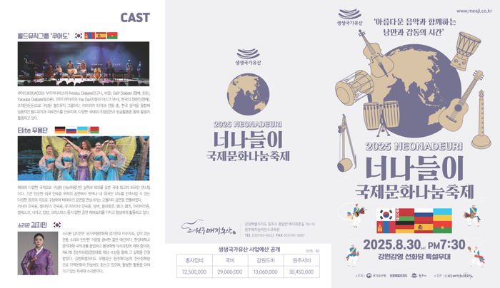 생생 국가유산 사업의 일환으로 추진되는 이번 너나들이 국제문화나눔축제에서는 원주매지농악, 국내 예술단체(원주시민국악관현악단, 소리꾼 김지민), 해외 공연팀(쿠아도, 엘리트) 등의 무대가 펼쳐질 예정이다.