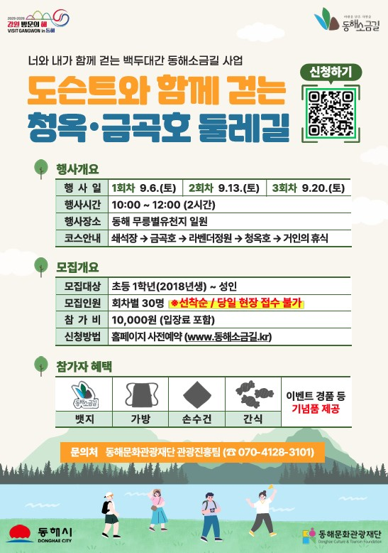 [스포츠서울ㅣ김기원기자]동해문화관광재단(대표이사 정연수, 이하 재단)은 9월 6일부터 3주간 매주 토요일, 동해시 무릉별유천지에서‘도슨트와 함께 걷는 청옥ㆍ금곡호 둘레길’ 트레킹 프로그램을 진행한다.