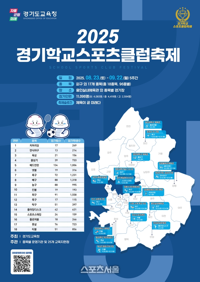 〔스포츠서울│수원=좌승훈기자〕경기도교육청은 23일부터 한 달 동안 도내 일원에서 학생의 건강한 성장과 올바른 인성 함양을 위한 ‘2025 경기학교스포츠클럽 축제’를 개최한다고 22일 밝혔다.
