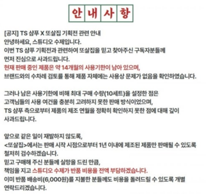 이어 “남은 사용 기한에 비해 최대 구매 수량(10세트)을 설정한 점은 구매자분들의 사용 여건을 충분히 고려하지 못한 판매 방식이었으며, TS 샴푸 측으로부터 제품의 제조 연월을 정확히 확인하지 못한 점에 대해 깊이 사과드린다”라며 고개를 숙였다.