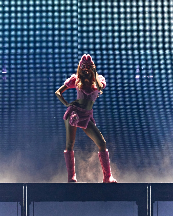 하트 모양 네크라인이 포인트인 퍼프 소매의 코르셋 상의와 깊은 옆트임이 돋보이는 미니스커트, 그리고 무릎까지 올라오는 핑크 퍼 롱부츠는 무대의 화려함과 리사의 개성을 모두 담아냈다. 또한 라부부 모자와 체인에 달린 라부부 키링을 비롯해, 귀여운 미니백까지 디테일을 살린 패션 센스를 자랑했다.