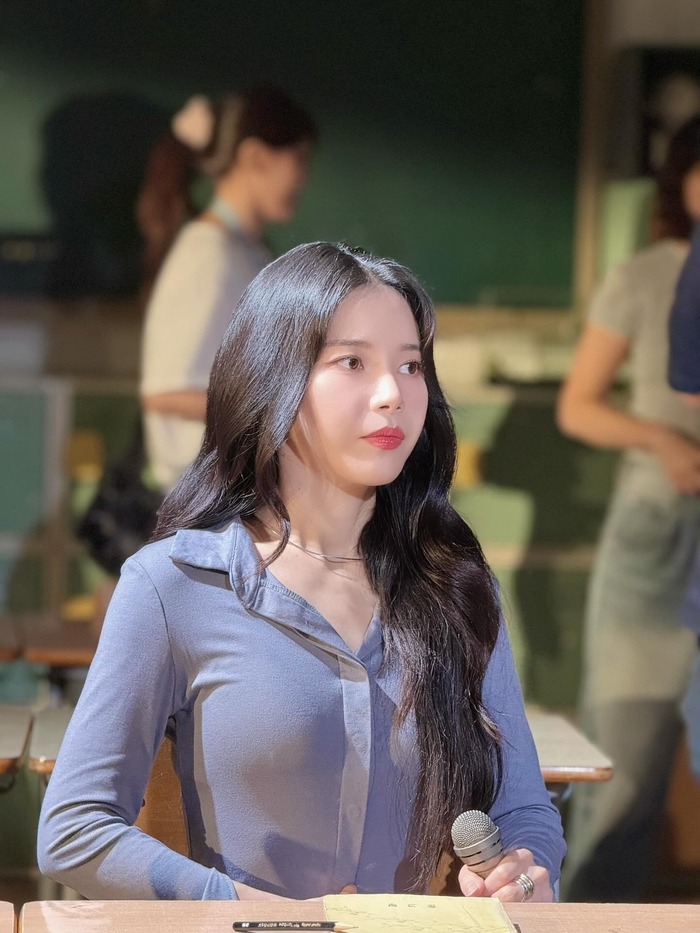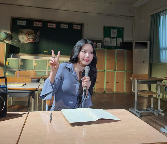 사진 속 솔라는 교실로 연출된 촬영장에서 마이크를 들고 앉아있는 모습, 밝은 미소와 함께 브이(V) 포즈를 취하는 등 경쾌하면서도 자신감 넘치는 모습을 보여줬다. 또 무대 뒤 대기실 앞에서는 심플하면서도 세련된 화이트 드레스를 입고 포즈를 취하고 있다.
