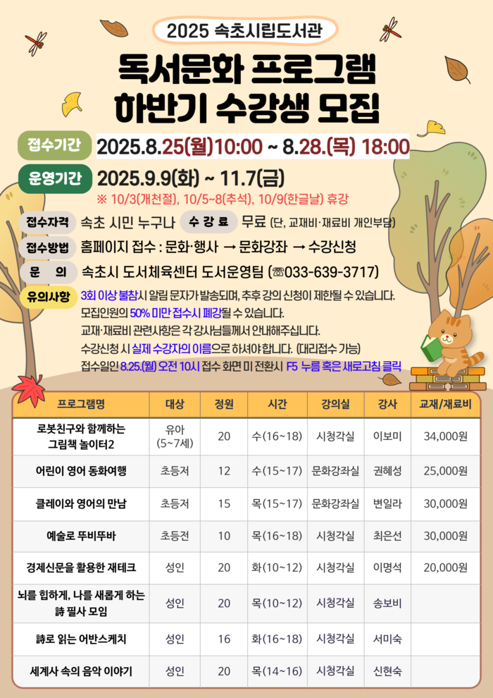 프로그램 강의 계획서 및 기타 사항은 속초시립도서관 누리집에서 확인할 수 있으며, 자세한 내용은 전화(033-639-3717)로 문의하면 된다.