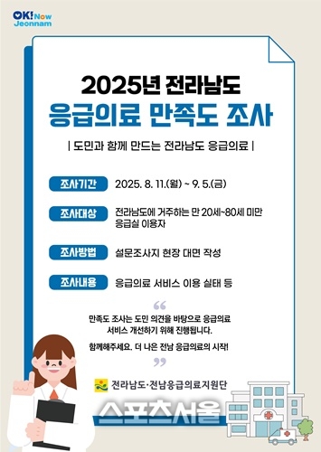 [스포츠서울┃조광태기자] 전라남도는 도민의 목소리를 반영해 응급실을 더 안전하고 따뜻하게 관리토록 하기 위해 9월 5일까지 지역 응급의료기관 38개소 응급실 이용객을 대상으로 2025년 응급의료 만족도 조사를 한다고 밝혔다.