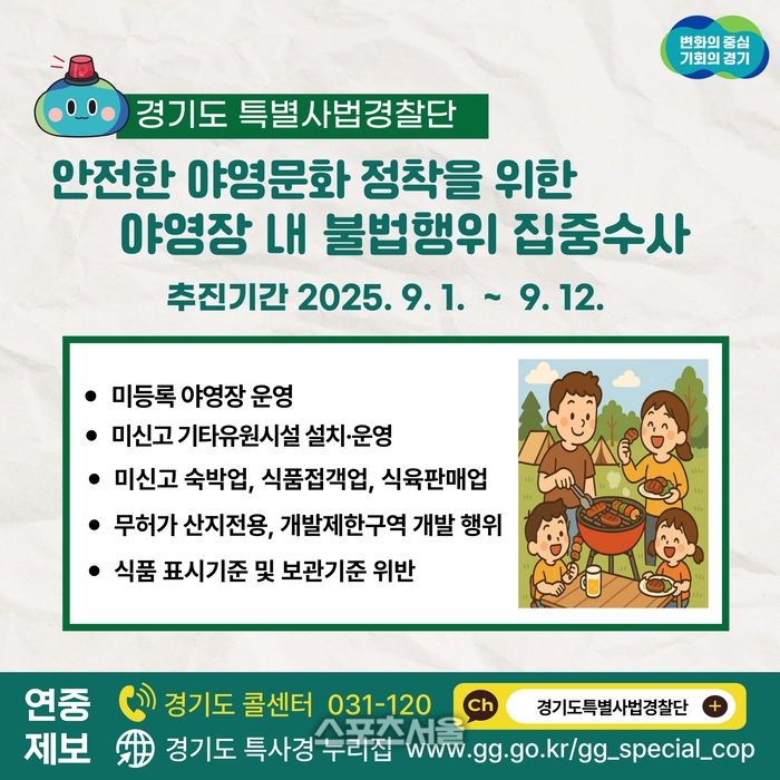 〔스포츠서울│수원=좌승훈기자〕경기도는 오는 9월 1일부터 12일까지 양주시, 양평군, 파주시 등 캠핑장 집중 지역을 중심으로 야영장 내 불법행위를 집중수사 한다고 25일 밝혔다.