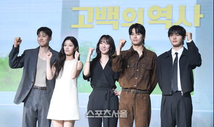 공명, 신은수, 남궁선 감독, 차우민, 윤상현(왼쪽부터)이 가 25일 서울 마포 호텔 나루 서울 엠갤러리에서 진행된 넷플릭스 ‘고백의 역사’ 제작보고회에서 포즈를 취하고 있다.