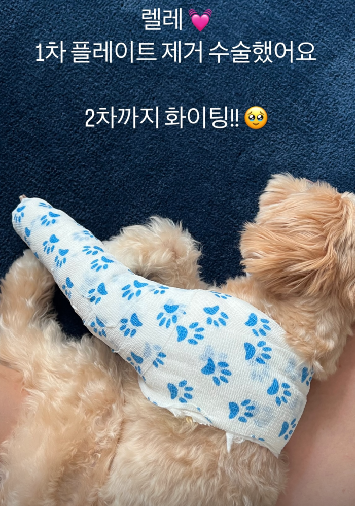 공개된 사진에는 앞 발에 붕대를 감은 반려견 렐레의 모습이 담겨있다. 한예슬은 “2차까지 파이팅!”이라는 글과 이모티콘을 덧붙이며 힘든 과정을 이겨내고 있는 반려견을 응원했다.