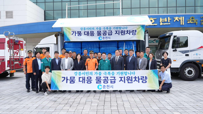 육동한 춘천시장은 이날 오전 호반체육관에 집결한 급수차량과 생수 배달 차량을 점검하고 관계자들을 격려했다. 급수 차량과 생수 차량은 강릉 홍제정수장 내 배수지로 이동해 생활용수에 활용할 계획이다. 이와 함께 생수 3,000개도 지원했다.