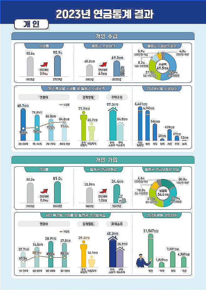 이들이 받은 월평균 연금액은 69만 5000원으로 전년보다 소폭 늘었지만, 2023년 1인 가구 최저생계비(124만 6000여 원)의 절반 수준에 그쳤다.