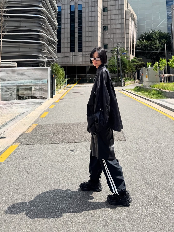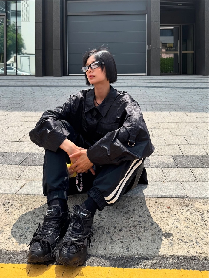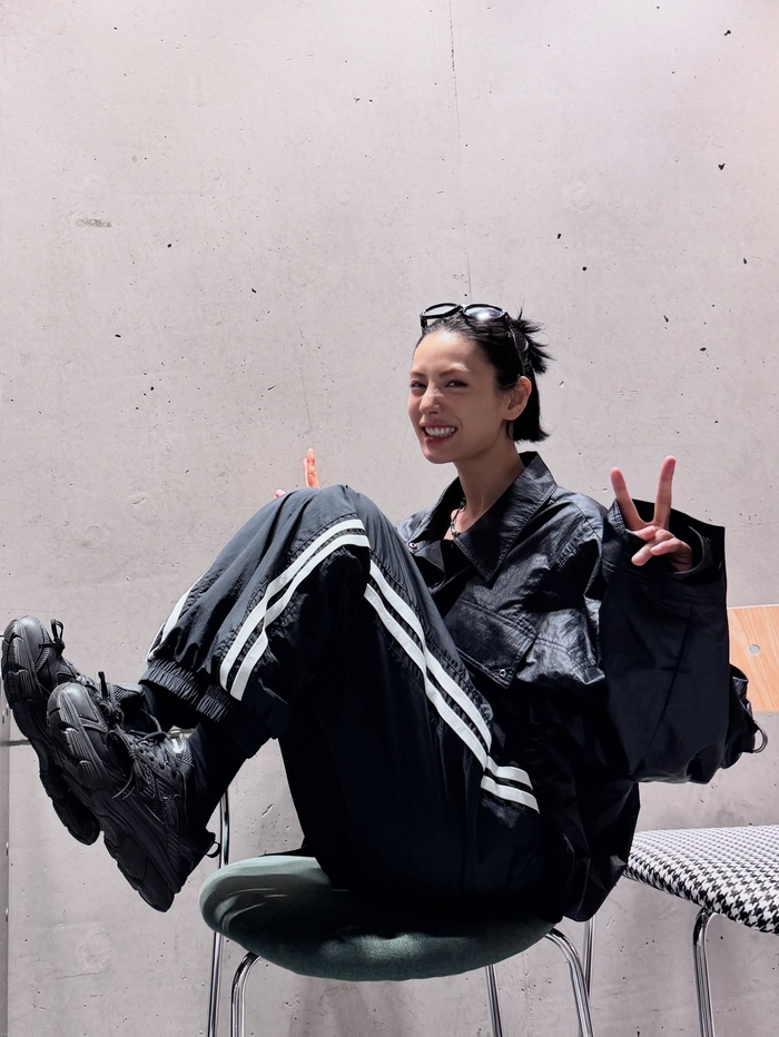 나나는 살짝 광택이 도는 검은색 셋업에 흰색 스트라이프가 포인트로 들어간 조거 팬츠를 매치해 스포티한 느낌을 강조했다. 여기에 볼드한 디자인의 블랙 스니커즈와 선글라스를 착용해 시크한 매력을 더했다.