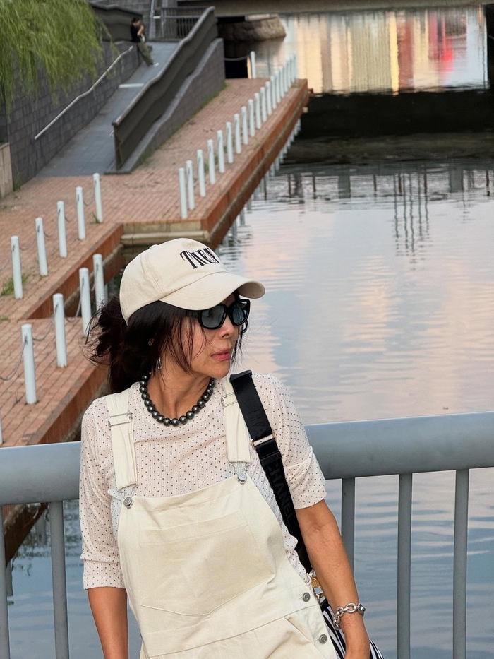 그는 흰색 민소매 상의에 베이직한 데님 멜빵 원피스를 매치했다. 이는 62라는 나이가 믿기지 않을 만큼의 동안 패션으로, 특유의 사랑스러운 매력을 돋보이게 했다. 여기에 검은색 조리 샌들을 착용해 편안하면서도 자연스러운 스타일을 완성했다.