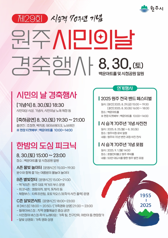 [스포츠서울ㅣ원주=김기원기자]원주시는 시 승격 70주년을 기념해 오는 30일 백운아트홀과 시청공원 일원에서 ‘제29회 원주시민의 날 경축행사’를 개최한다.