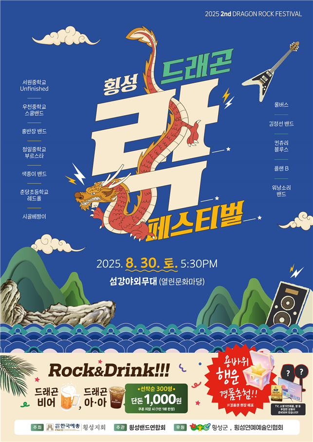[스포츠서울ㅣ김기원기자]횡성의 상징적 전설인 섬강 ‘용바위’가 음악으로 되살아난다. 한국예총 횡성지회(지회장 정재영)는 오는 30일 오후 5시 30분, 섬강 야외무대(열린문화마당)에서 「2025 횡성 드래곤 락 페스티벌」을 개최한다.