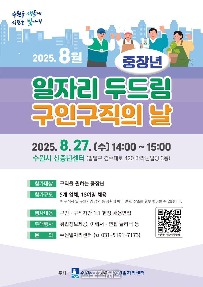 〔스포츠서울│수원=좌승훈기자〕경기 수원시는 오는 27일 오후 2시부터 3시까지 신중년센터에서 ‘8월 일자리 두드림 구인·구직의 날’ 행사를 개최한다고 26일 밝혔다.