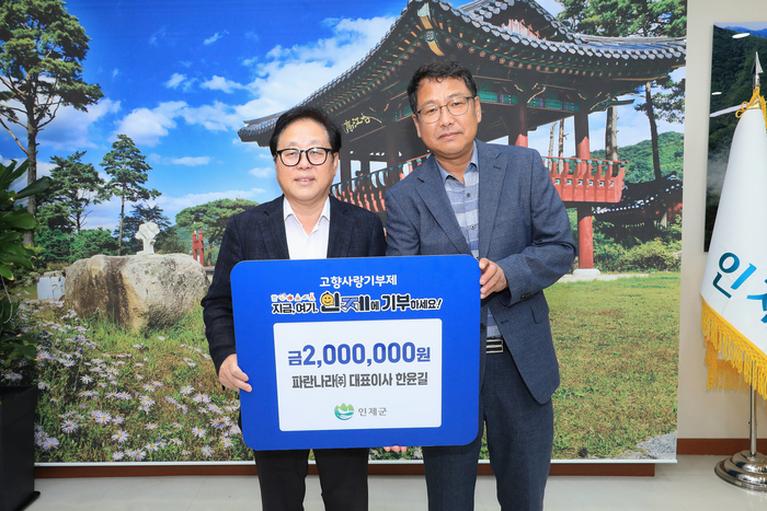 [스포츠서울ㅣ김기원기자]파란나라 주식회사 한윤길 대표이사가 26일 인제군에 고향사랑기부금 200만원을 기탁하고 인제군의 발전을 응원했다.