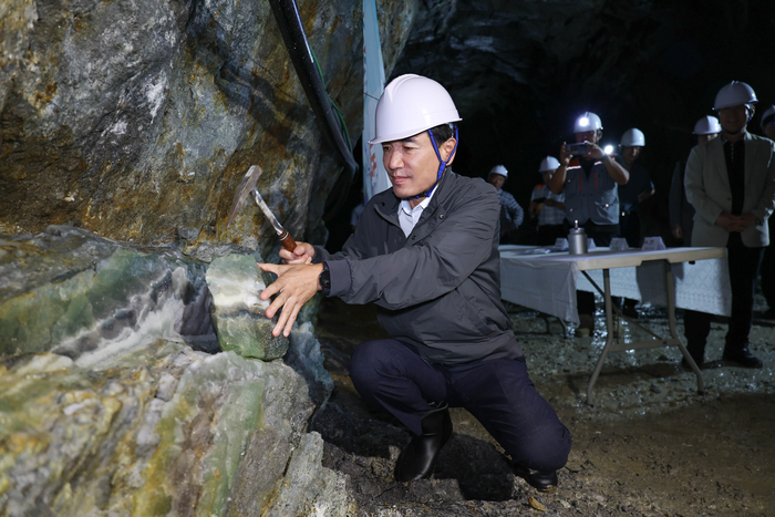 김 지사는 광산에 입갱해 형석 광맥을 확인하고 채굴 작업에도 참여했다. 이어 채굴된 형석이 불화수소 → 실리콘 웨이퍼 →반도체 칩으로 이어지는 생산 흐름을 시각 자료로 설명하며, 형석 자원이 첨단산업과 직결되는 전략적 자원임을 강조했다.