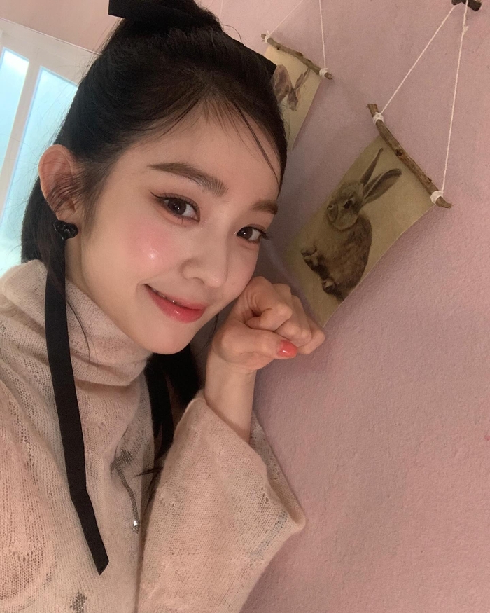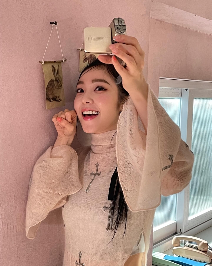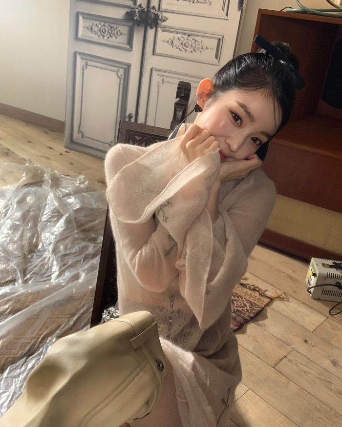 사진 속 아이린은 크림빛 시스루 니트에 은은하게 반짝이는 십자가 무늬가 포인트인 의상을 입고, 긴 생머리에 리본을 더해 우아하면서도 세련된 분위기를 자아냈다.