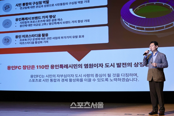 〔스포츠서울│용인=좌승훈기자〕이상일 용인특례시장은 26일 오후 시청 에이스홀에서 열린 ‘용인특례시 시민프로축구단 창단 진행상황 보고회’에서 “힘찬 도전과 멋진 승부로 110만 용인시민의 큰 사랑을 받는 프로축구단이 되도록 응원하고 지원하겠다”고 앞으로의 목표와 운영을 설명했다.